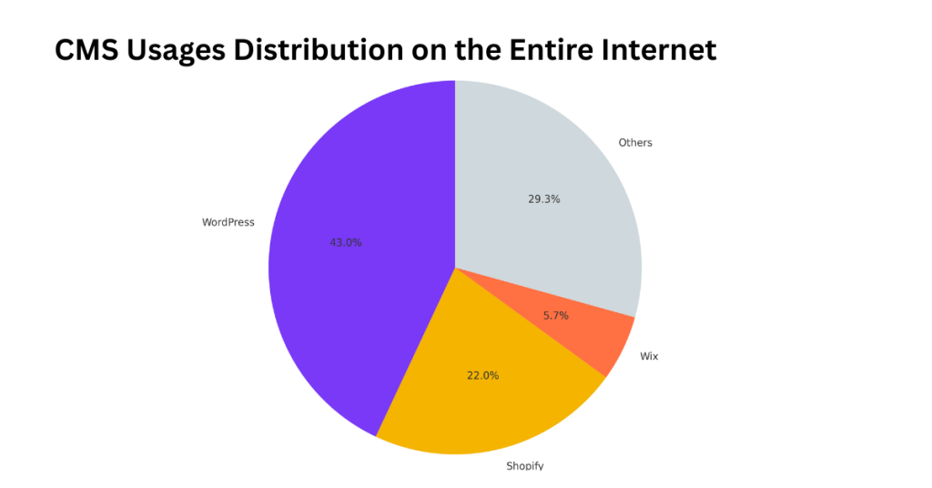 A content management system (CMS) is software that lets you build and manage a website without coding everything by hand. WordPress, Wix, Shopify, Joomla, and Drupal are all examples. So, when we talk about market share, we’re talking about what percentage of all active websites run on one of these platforms.
