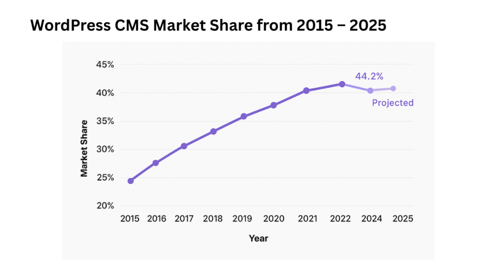 Below is a simplified chart inspired by W3Techs and Statista, showing how the WordPress CMS market share has changed from 2015 to 2025.