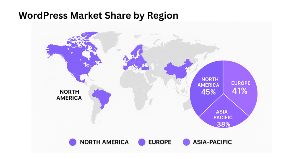 WordPress’s popularity looks different around the world. While it dominates in North America and Europe, emerging regions in Asia and South America are quickly adopting it too, often through localized hosting providers and translation-ready themes.
