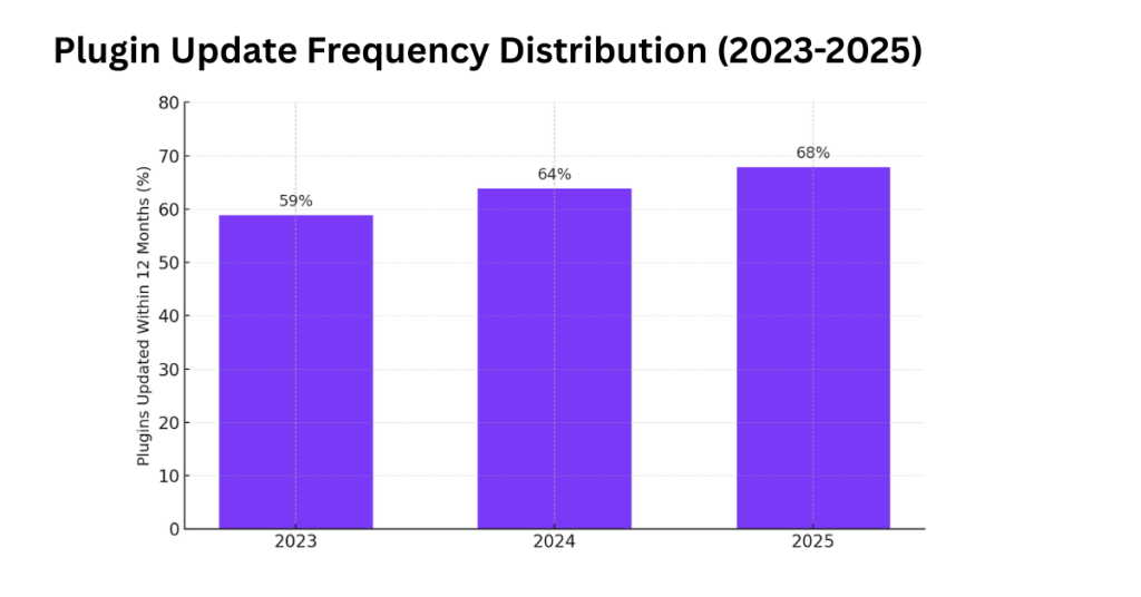 As of 2025, about 68% of active plugins were updated within the past year, while 32% haven’t seen an update in over 12 months (WordPress.org). Outdated plugins are five times more likely to cause security or compatibility issues (WPScan).
