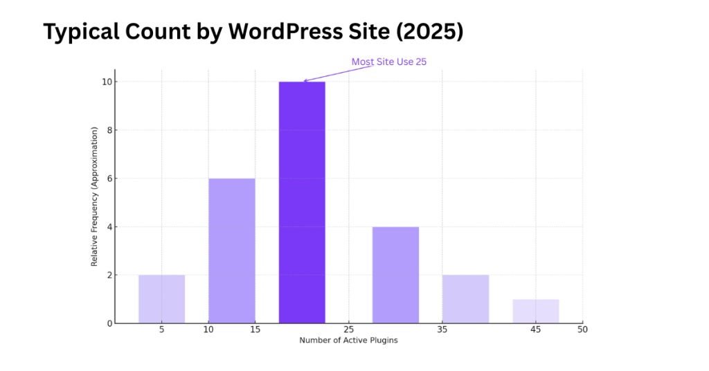 After seeing which plugins dominate by category, the next question is how many the average site actually runs. According to data from WordPress.org, WP Engine, and ManageWP, most WordPress websites use between 15 and 25 active plugins. That number has stayed steady for the past few years, even as plugin quality and efficiency have improved.